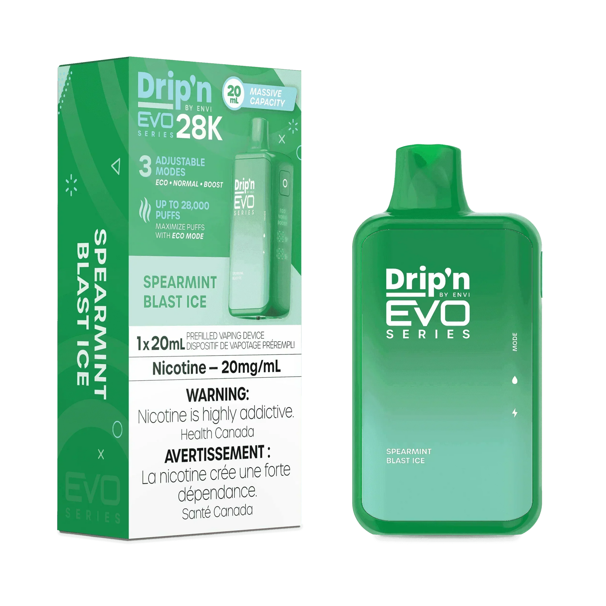 Le Drip'n EVO 28K est doté d'un système de bobine à double maille pour une saveur et une production de vapeur améliorées. Avec des modes réglables (Eco (9 W), Normal (12 W) et Boost (20 W), vous pouvez personnaliser l'intensité de votre expérience de vapotage. L'écran LED vous informe du mode, des niveaux d'e-liquide et de la durée de vie de la batterie, tandis que le flux d'air réglable permet un tirage sur mesure. Équipé d'une capacité d'e-liquide de 20 ml et d'une recharge USB-C, Spearmint Blast Ice garantit des performances constantes et fluides tout au long de la journée.