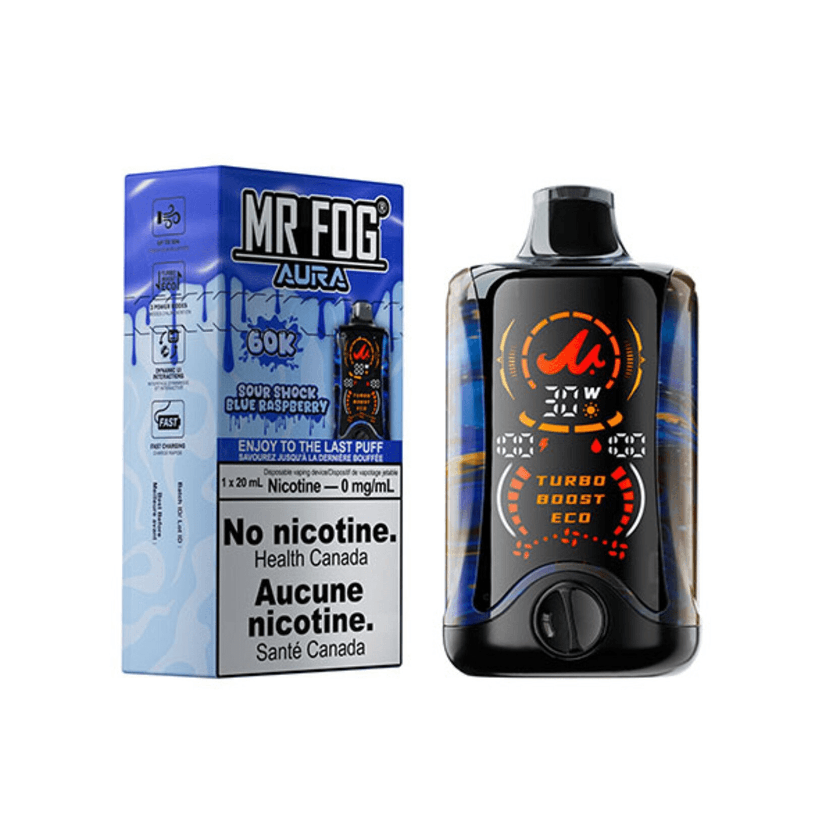 Sour Shock Blue Raspberry AURA 60K Disposable Vape by Mr Fog delivers an electrifying burst of tangy blue raspberry with a candy-inspired twist. The inhale hits with sour zing, followed by a wave of sweet berry that balances the tartness—making this vape a must-try for fans of bold, sour fruit profiles.